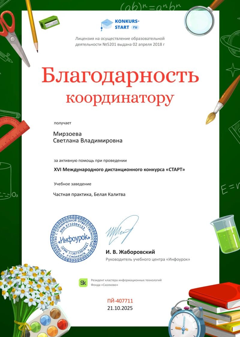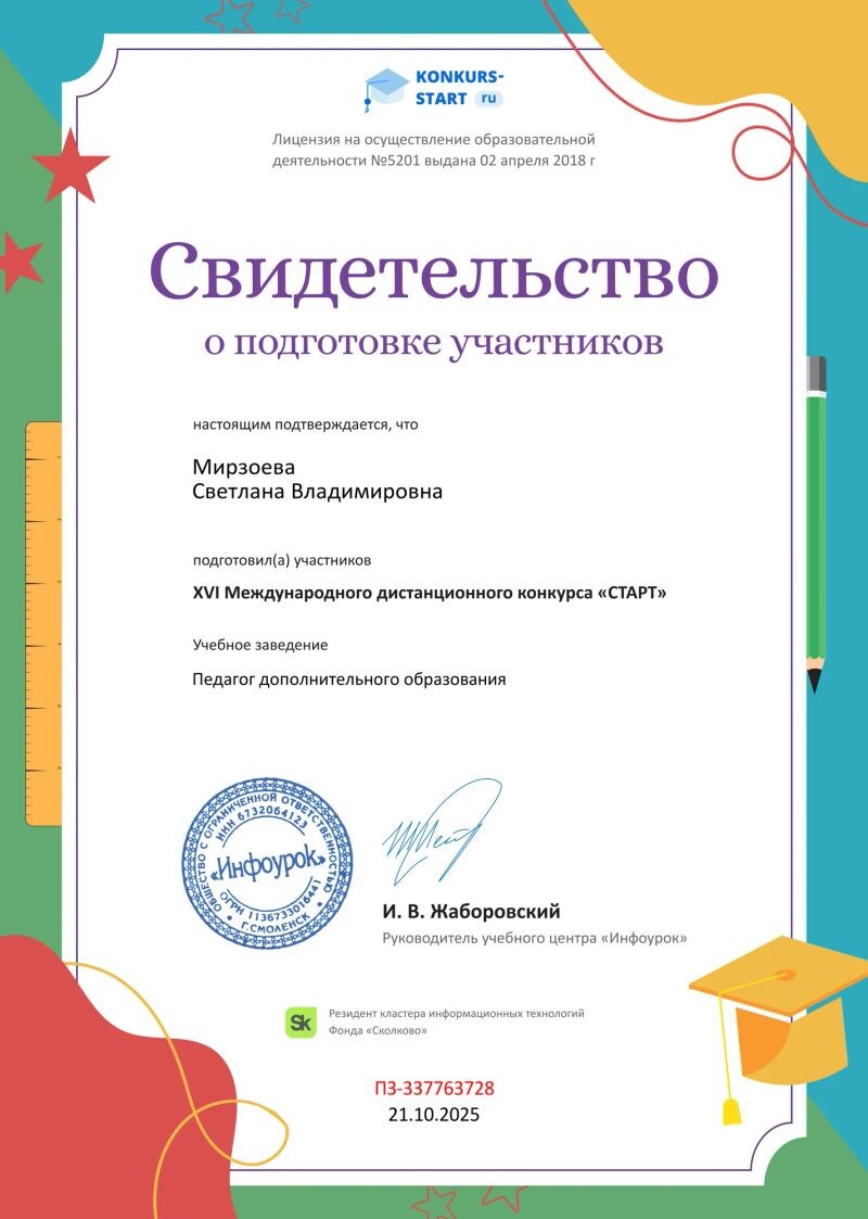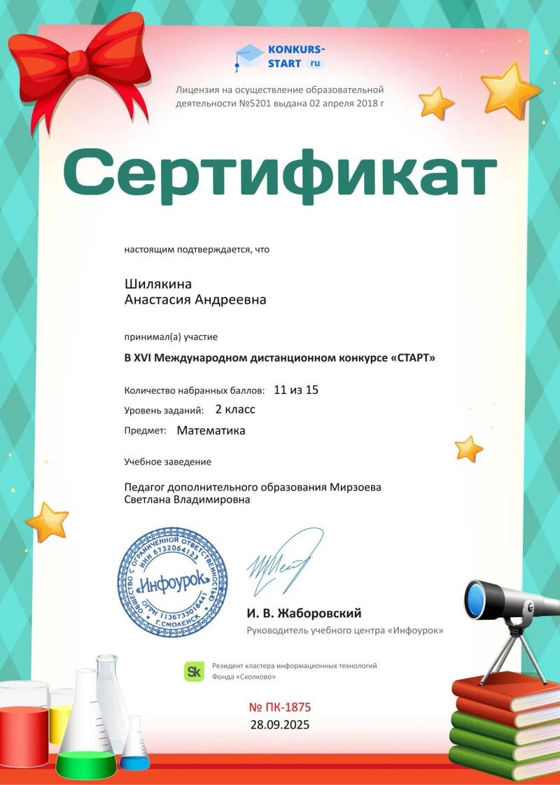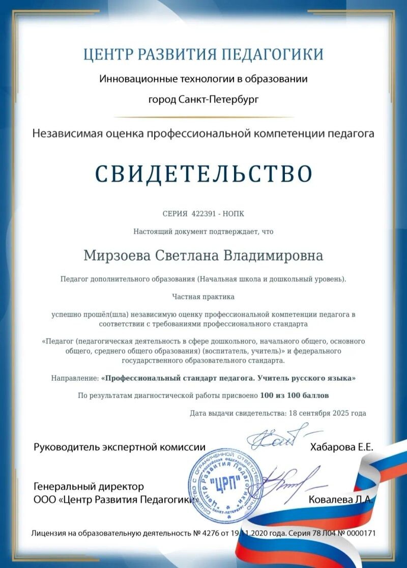 - Свидетельство о прохождении обучения курсов повышения квалификации "Особенности работы с учащимися с синдромом дефицита внимания" (с 2025 г.).
