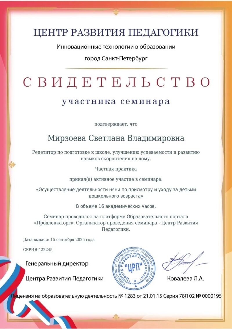- Семинар "Осуществление деятельности няни по присмотру и уходу за детьми дошкольного возраста" (с 2025 г.).