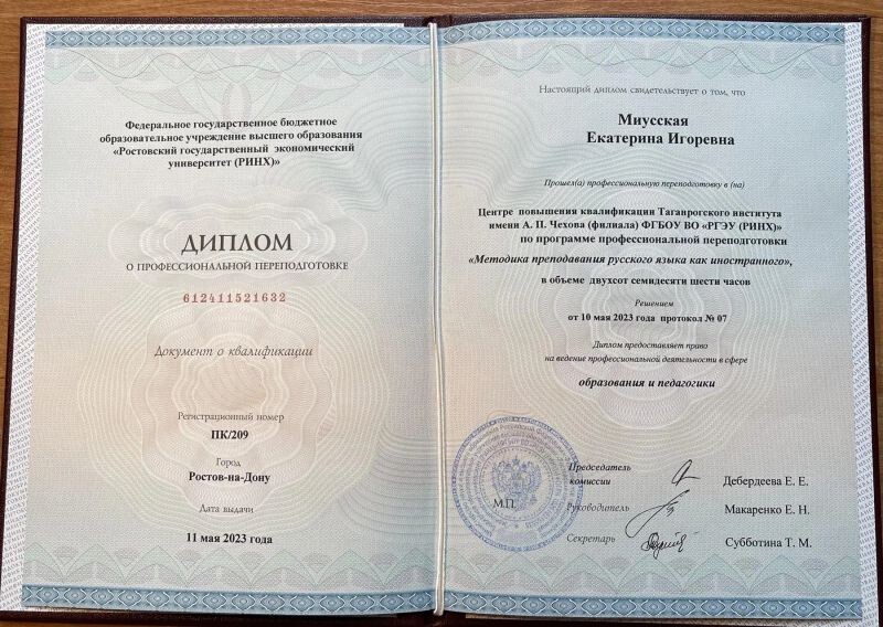- РГЭУ (РИНХ), программа «Методика преподавания русского языка как иностранного», 2023 г.