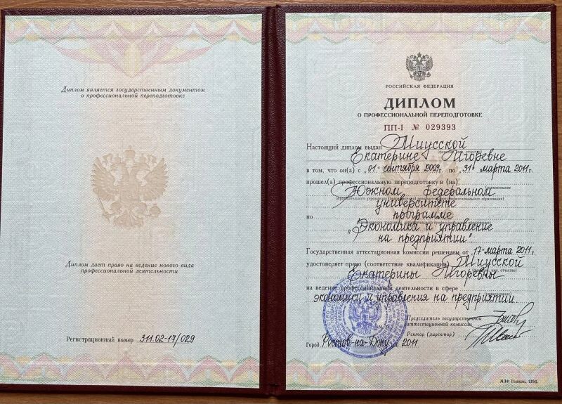 - Южный федеральный университет, программа «Экономика и управление на предприятии», 2009–2011 гг.