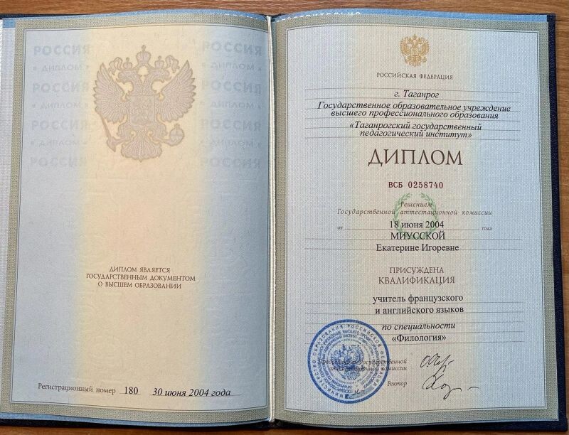 - ТГПИ, факультет иностранных языков, квалификация «учитель английского и французского языков», 1999–2004 гг.