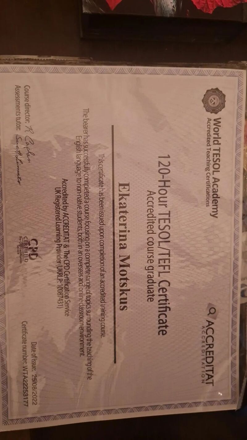 - 120-hour TESOL/TEFL Certificate, 2022 г.