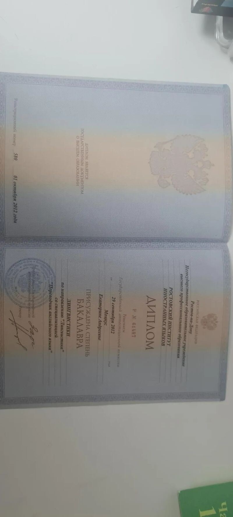 - Ростовский институт иностранных языков, специальность «переводчик английского языка», направление «Лингвистика», 2007–2012 гг.