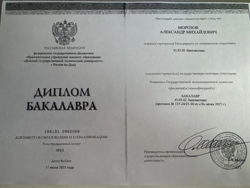 - ФГБОУ ВО «Донской Государственный Технический Университет», Прикладная Лингвистика, Лингвистика, 2021–2025 гг.