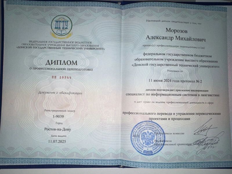 - ФГБОУ ВО «Донской Государственный Технический Университет», «Цифровая лингвистика», Лингвистика, 2023–2024 гг.