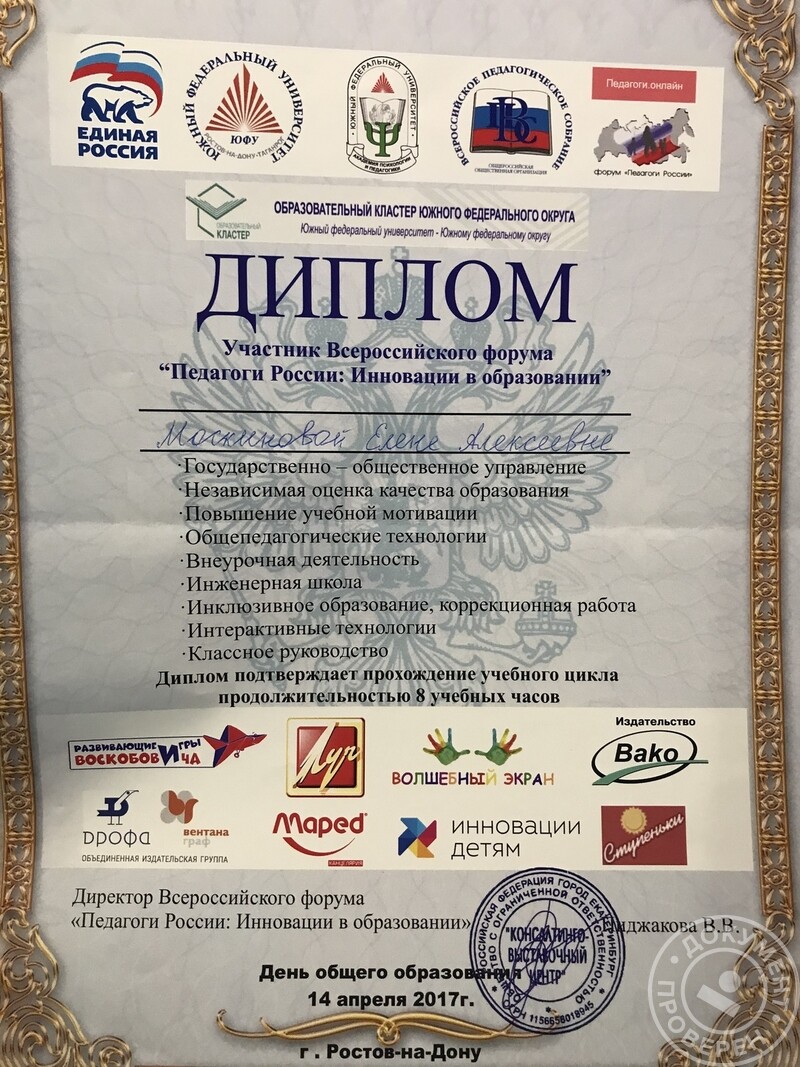 - Участник всероссийского форума «Педагоги России: инновации в образовании», 2017 г.