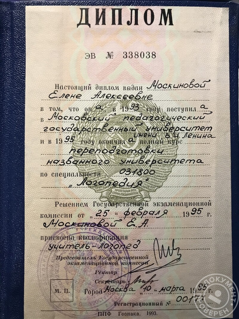 - Московский педагогический государственный университет, специальность – логопедия, 1992–1995 гг.