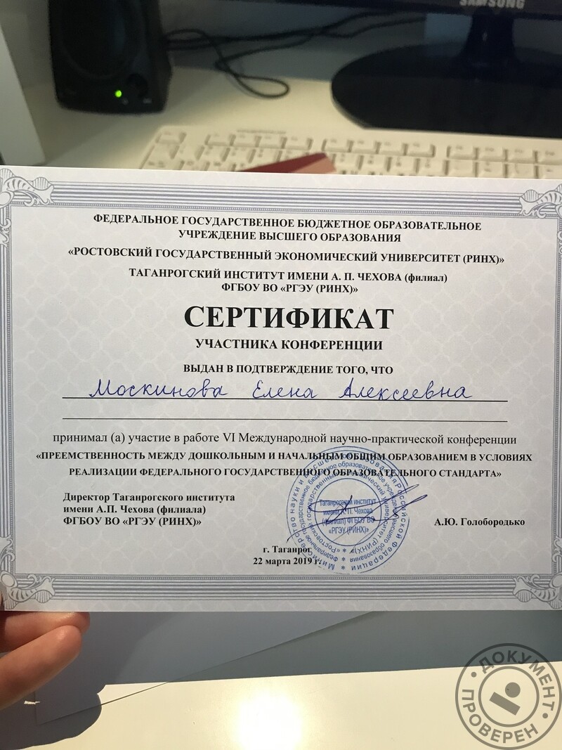 - Участник VI Международной научно-практической конференции «Преемственность между дошкольным и начальным общим образованием», сертификат, 2019 г.