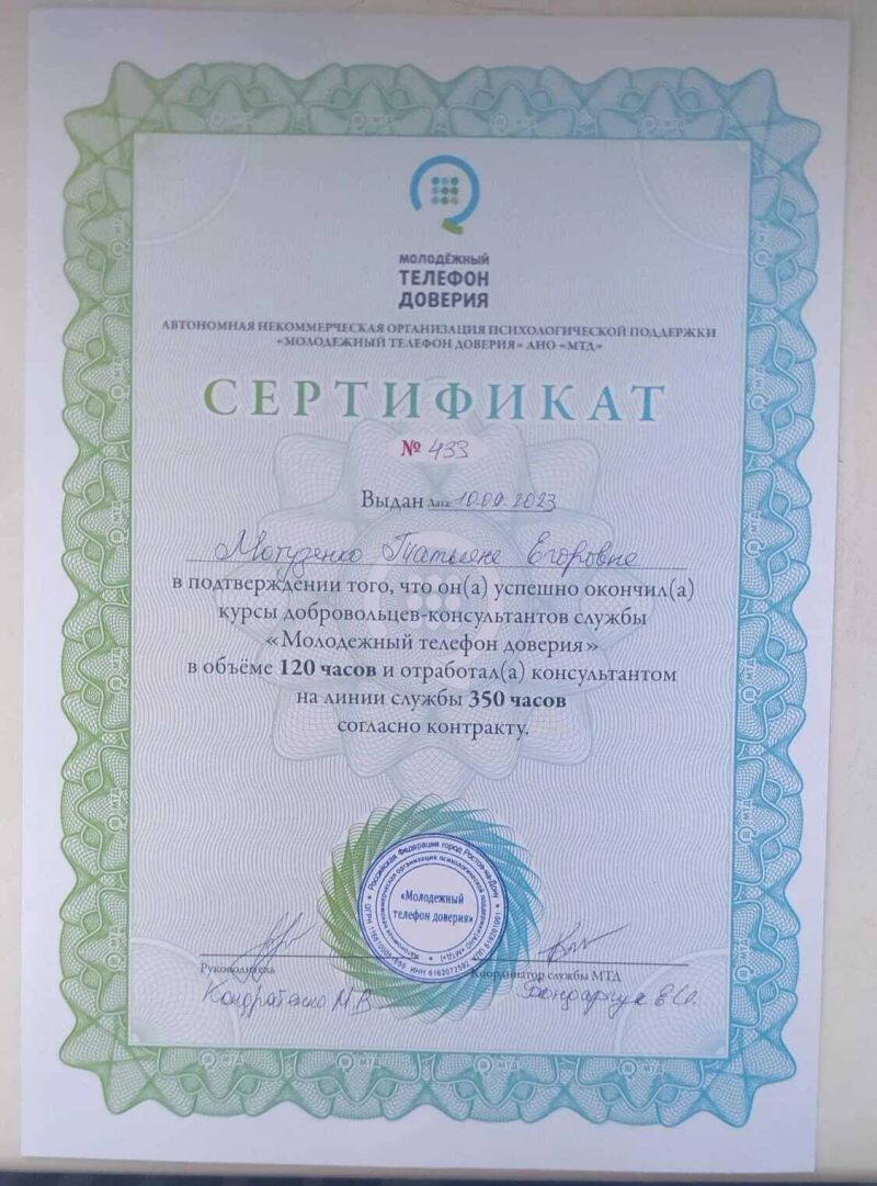- Работала год на "Молодежном телефоне доверия" . Сталкивалась с такими проблемами, как суицидальные мысли, тревожность, депрессия, семейные и детско-родительские отношения (с 2023 г.).