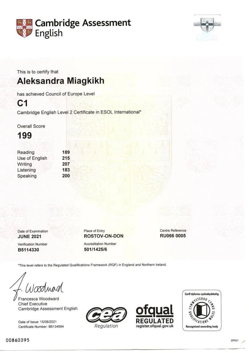 - Участие в международной олимпиаде для преподавателей английского языка от Skyteach и Cambridge Assessment English (72 балла из 100), 2019 г.