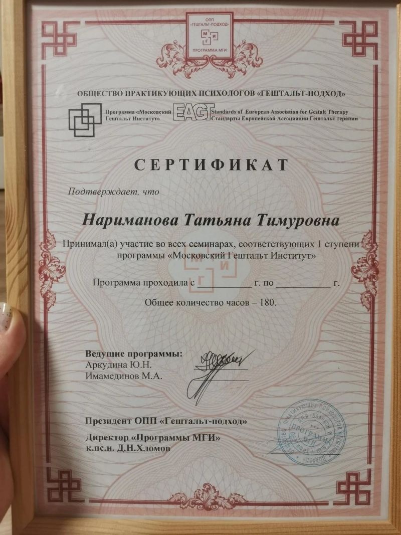 - Московский гештальт институт , Гештальт, 593 часов (с 2021 г.).