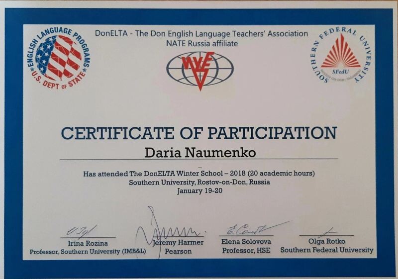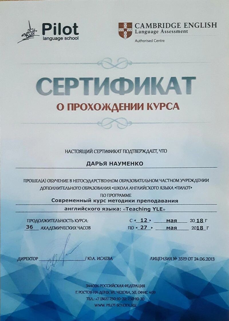 - Школа английского языка «Пилот», программа – современный курс методики преподавания английского языка: teaching YLE, 2018 г.