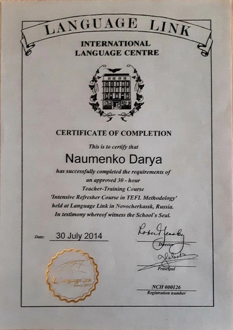 - International language centre, курс по методике преподавания «Intensive refresher course in TEFL methodology», 2014 г.