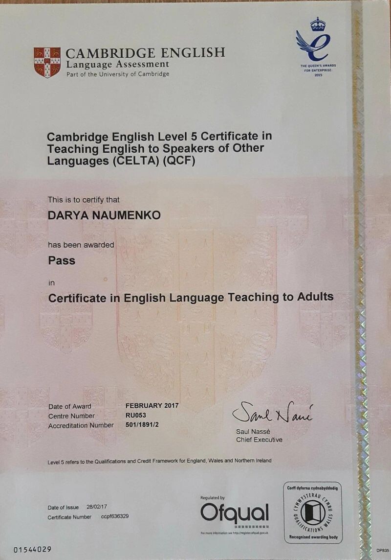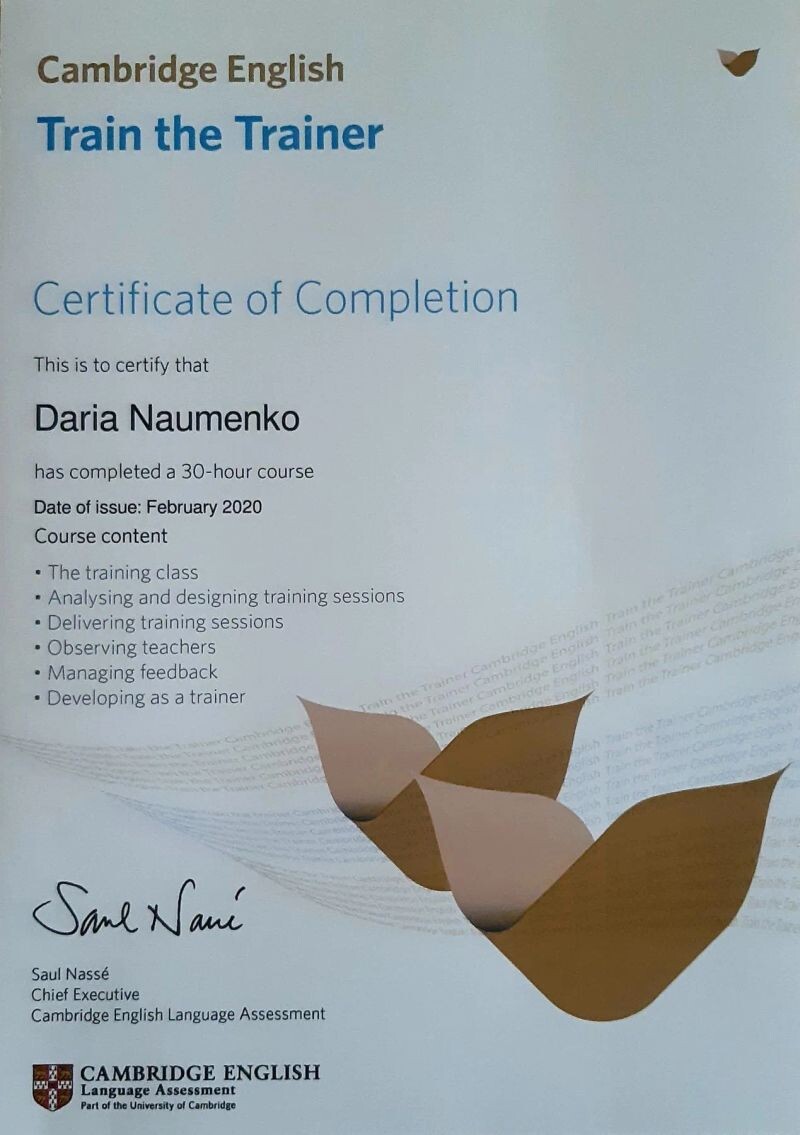 - Кембриджский сертификат Cambridge Train the Trainer, 2020 г.