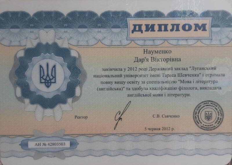 - Луганский национальный университет имени Т.Г. Шевченко, факультет иностранных языков, кафедра английской филологии, филолог, магистр английского языка и литературы, 2012 г.