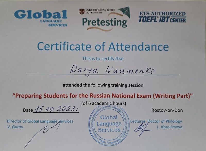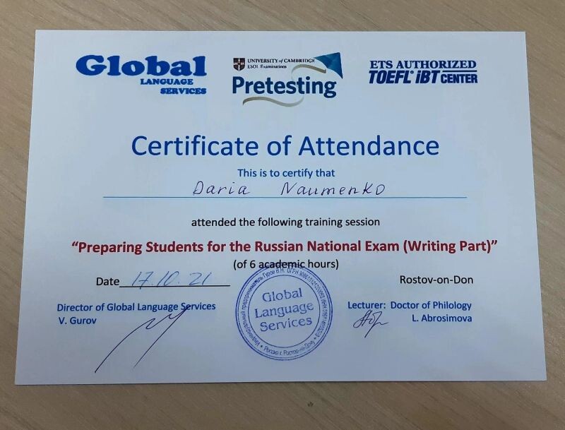 - Global Language Services, практический семинар «Preparing Students for the Russian State Exam» (Подготовка к ЕГЭ) (с 2021 г.).