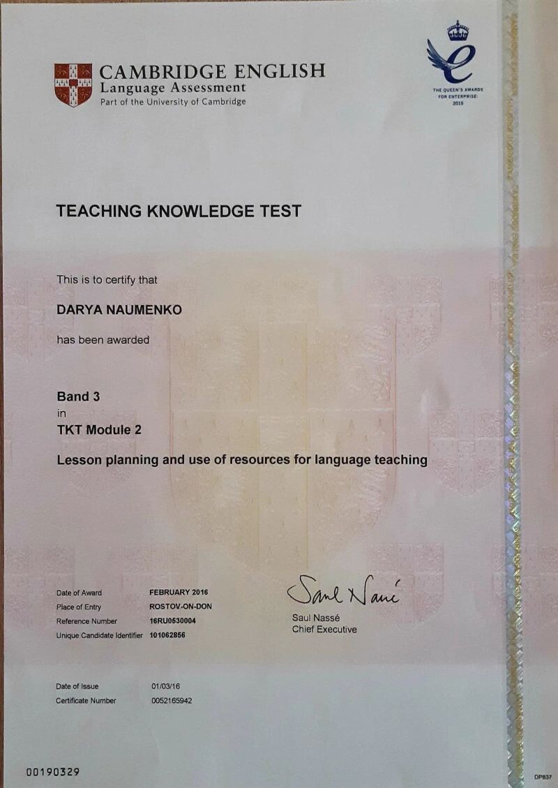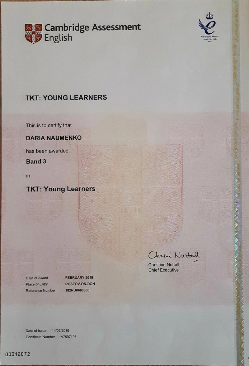 - TKT Young Learners, международная квалификация для учителей английского, занимающихся обучением детей в возрасте от 6 до 12 лет, 2019 г.