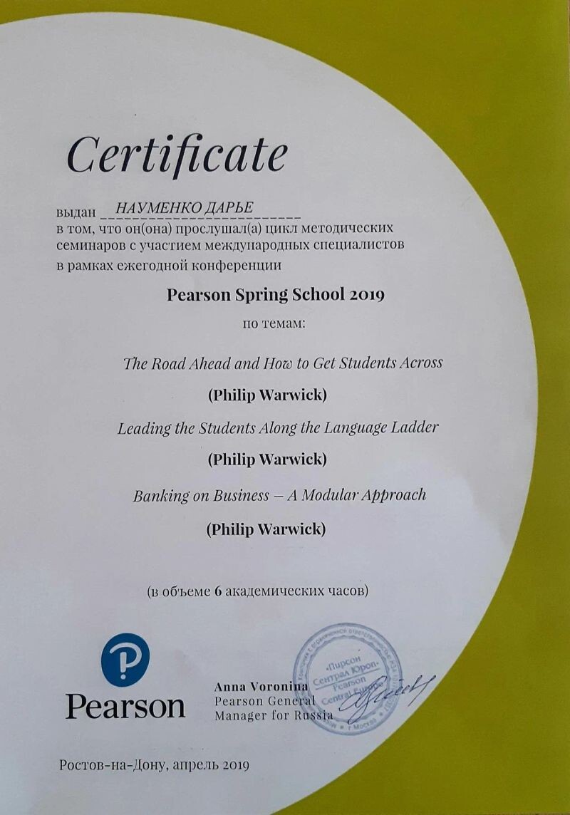 - Pearson spring school, цикл методических семинаров с участием международных специалистов, 2019 г.