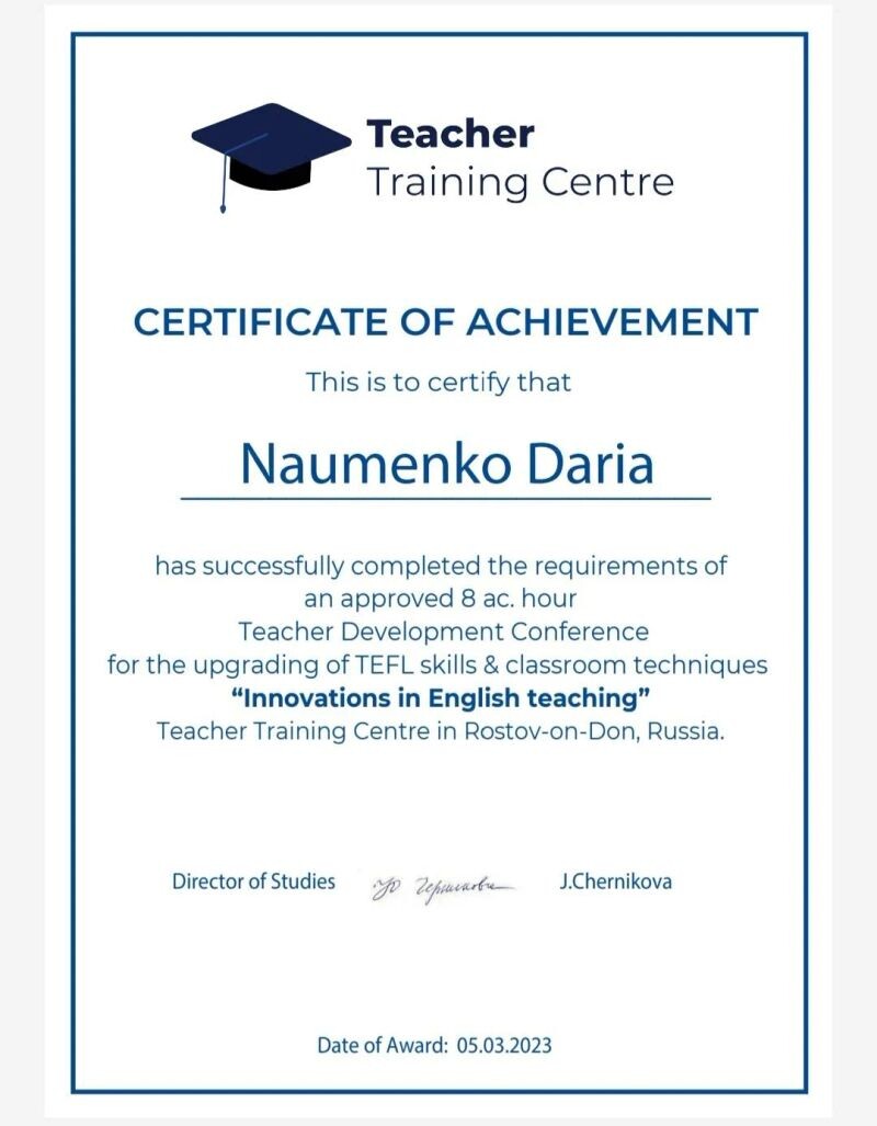 - Teacher Training Center, «Innovations in English teaching», 2023 г.