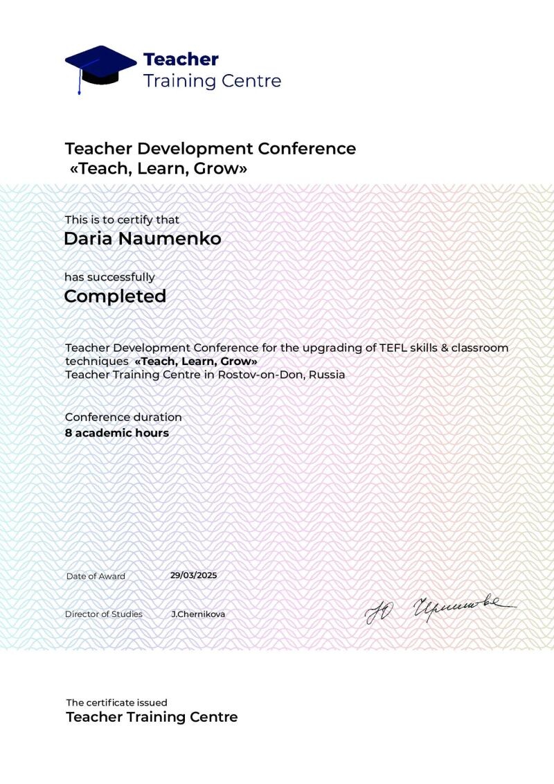 - Teacher Training Centre, Teacher Development Conference «Teach, Learn, Grow», 2025 г.