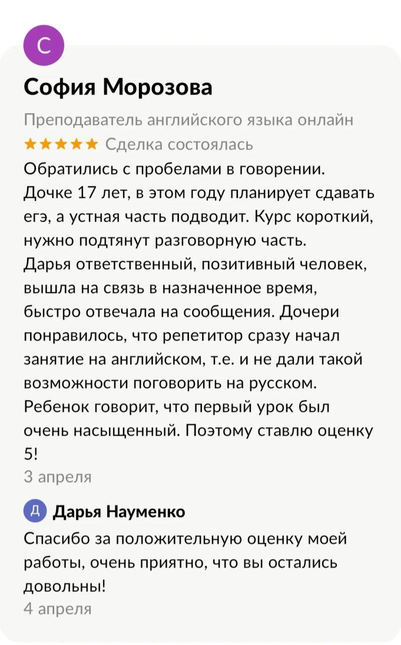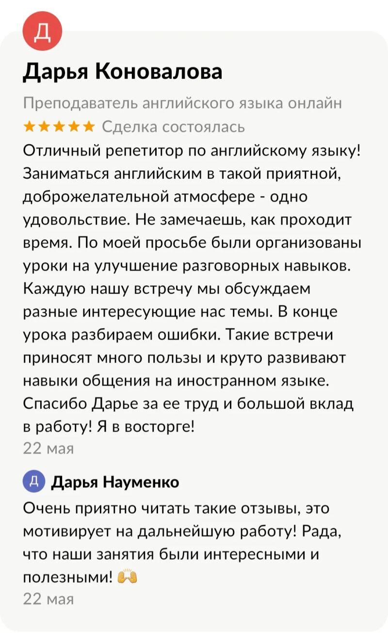 Мои первые занятия с Дарьей оставили на меня отличное впечатление. Она очень тщательно готовится к урокам, а занятия проходят увлекательно и насыщено. У меня средний уровень языка и я готовлюсь к собеседованию, и Дарья постоянно адаптирует задания под мои нужды. Она всегда приходит вовремя, дружелюбна и открыта к общению. Мне нравится, что уроки проводятся на английском, это помогает мне лучше понимать устную речь. Также Дарья всегда дает дополнительные материалы и ресурсы, которые я могу использовать в свободное время. Я уверен, что мой выбор репетитора был правильным и я буду продолжать заниматься с ней!