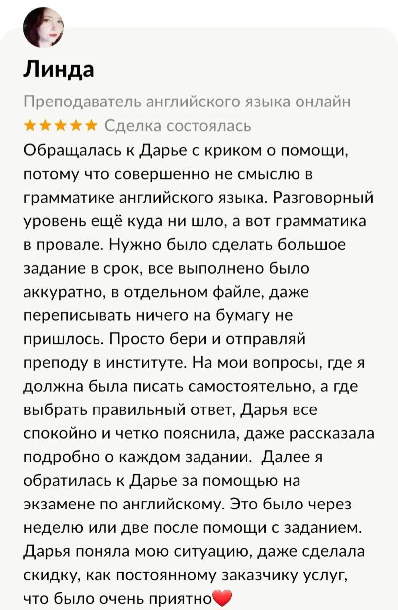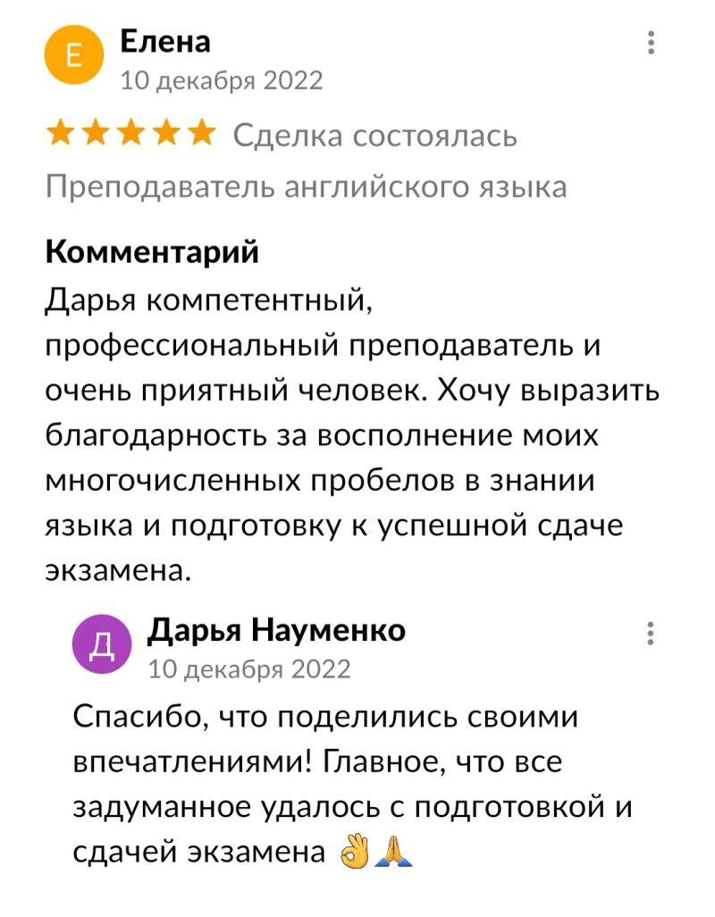 Описание: Занимаемся на протяжении 6 месяцев. Отличный репетитор Дарья, доходчиво и грамотно объясняет весь материал. Профессионально и ответственно выполняет свою работу! одна из задач была повысить разговорный английский, уже без страха и стеснения могу выражать свою мысль на английском. За что благодарна, Дарье! Также заметила значительные улучшения в грамматике. Спасибо большое! Все нравится !!