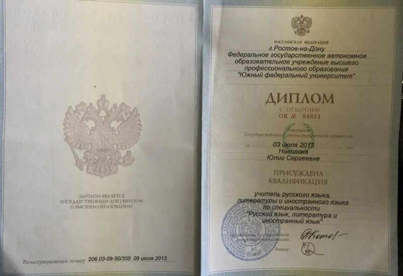 - Южный федеральный университет, учитель русского языка, литературы и иностранного языка по специальности «русский язык, литература и иностранный язык», 2008–2013 гг.