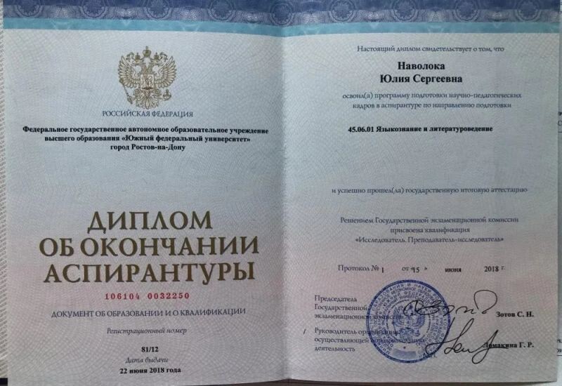 - Южный федеральный университет, языкознание и литературоведение, аспирантура, исследователь, преподаватель-исследователь, 2015–2018 гг.