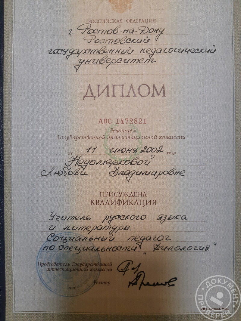 - Ростовский государственный педагогический университет, факультет филологии, специальность - учитель русского языка и литературы, социальный педагог, 1997–2002 гг.