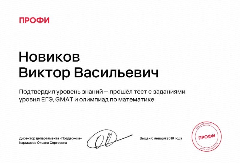 - Подтвердил уровень знаний — Прошёл тест с заданиями уровня ЕГЭ, GMAT и олимпиад по математике (с 2019 г.).