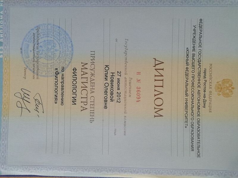 - Южный федеральный университет, магистр филологии, 2012 г.