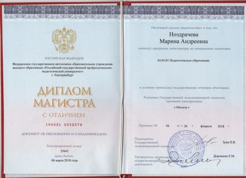 - Российский государственный профессионально-педагогический университет, программа «Педагогическое образование», магистр, 2015–2018 гг.