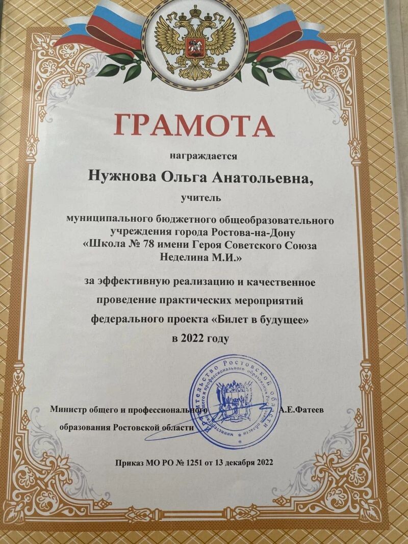 - Министерство общего и профессионального образования, грамота за эффективную реализацию и качественное проведение практических мероприятий федерального проекта «Билет в будущее», 2022 г.