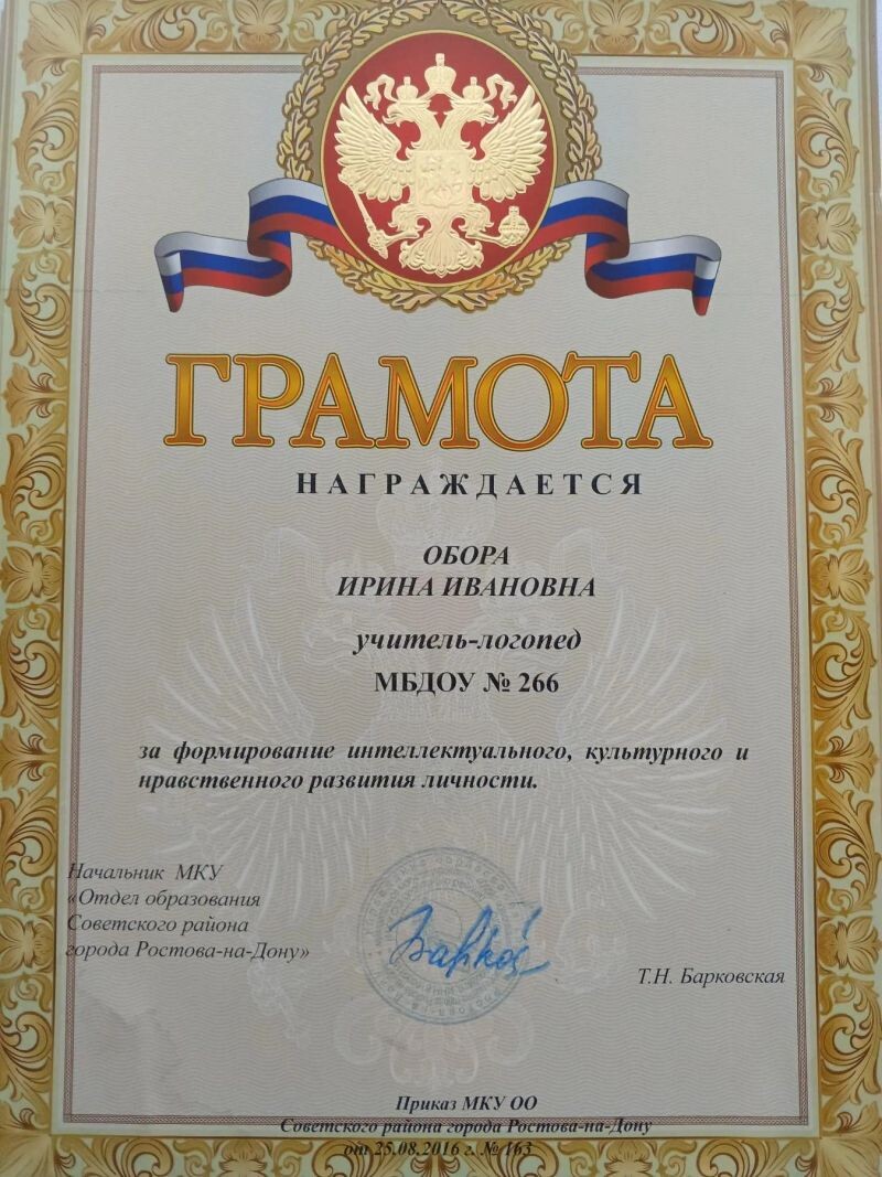 - МКУ Отдел образования Советского района г. Ростова-на-Дону, грамота за формирование интеллектуального, культурного и нравственного развития личности, 2016 г.