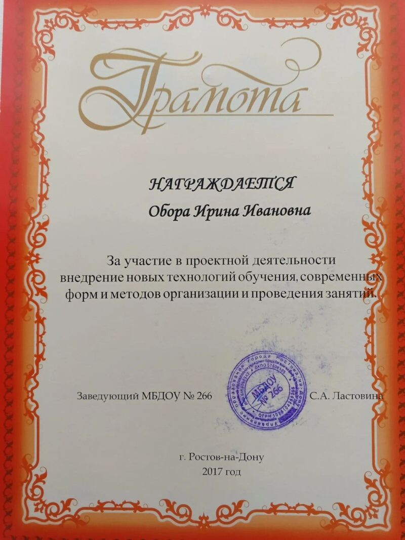 - МБДОУ № 266, грамота за участие в проектной деятельности внедрение новых технологий обучения, современных форм и методов организации и проведения занятий, 2017 г.