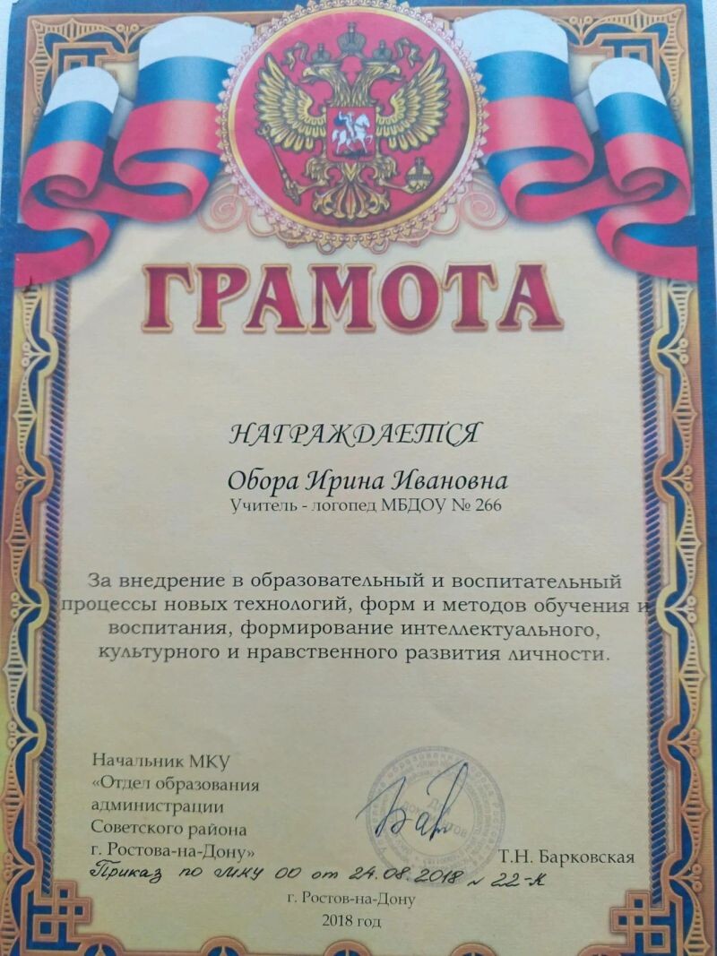 - МКУ Отдел образования Советского района г. Ростова-на-Дону, грамота за внедрение в образовательный и воспитательные процессы новых технологий, форм и методов обучения и воспитания, формирование интеллектуального и культурного развития личности, 2018 г.