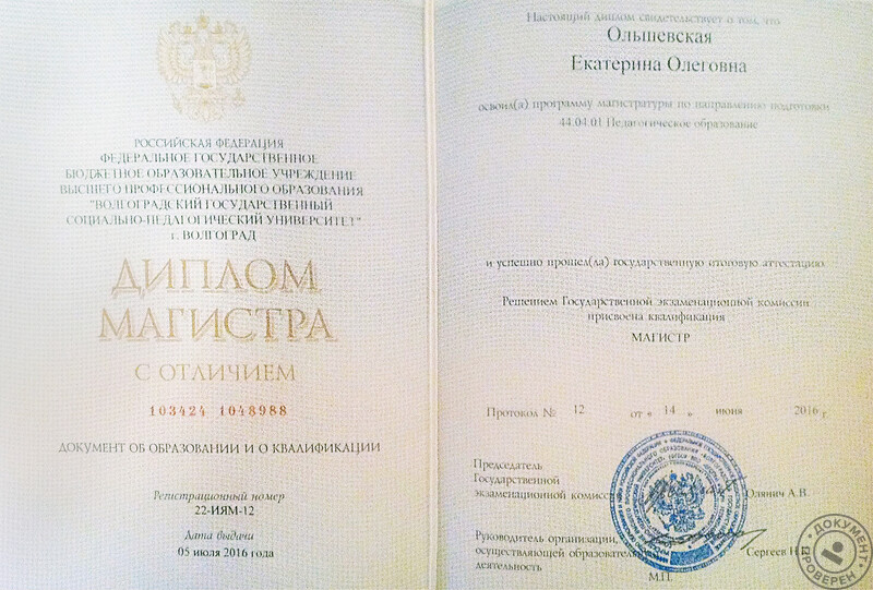 - Направление – педагогическое образование, профиль – иностранный язык, магистр, диплом с отличием, 2016 г.