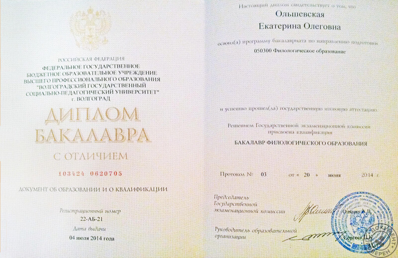 - Волгоградский государственный социально-педагогический университет, Институт иностранных языков, направление – филологическое образование, профиль – иностранный язык, бакалавр, диплом с отличием, 2014 г.