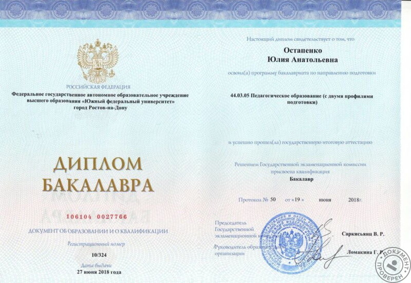 - ЮФУ, Институт филологии, журналистики и межкультурной коммуникации, педагогическое образование: два профиля подготовки (русский и английский языки), бакалавр, 2013–2018 гг.