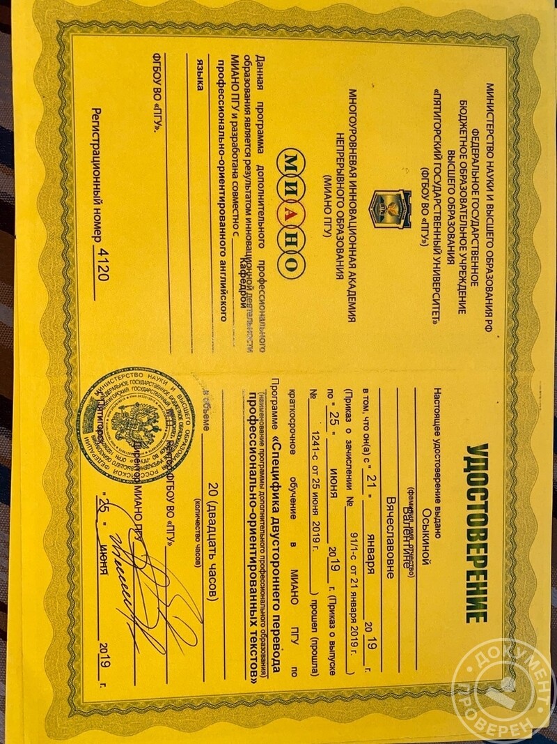 - Пятигорский государственный университет, МИАНО, специфика двустороннего перевода професионально-ориентированных текстов, 2018–2019 гг.