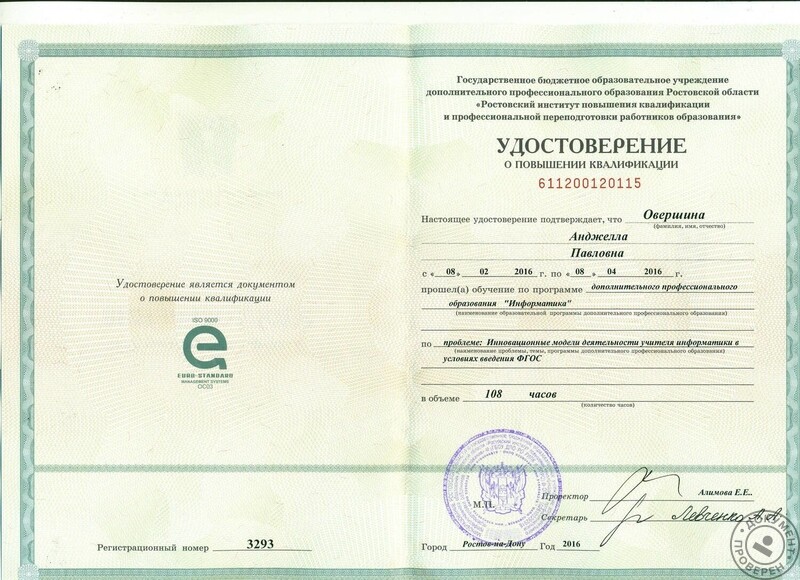 - ИПК ИПРО, получена дополнительная квалификация «учитель информатики» (2006 г.).
