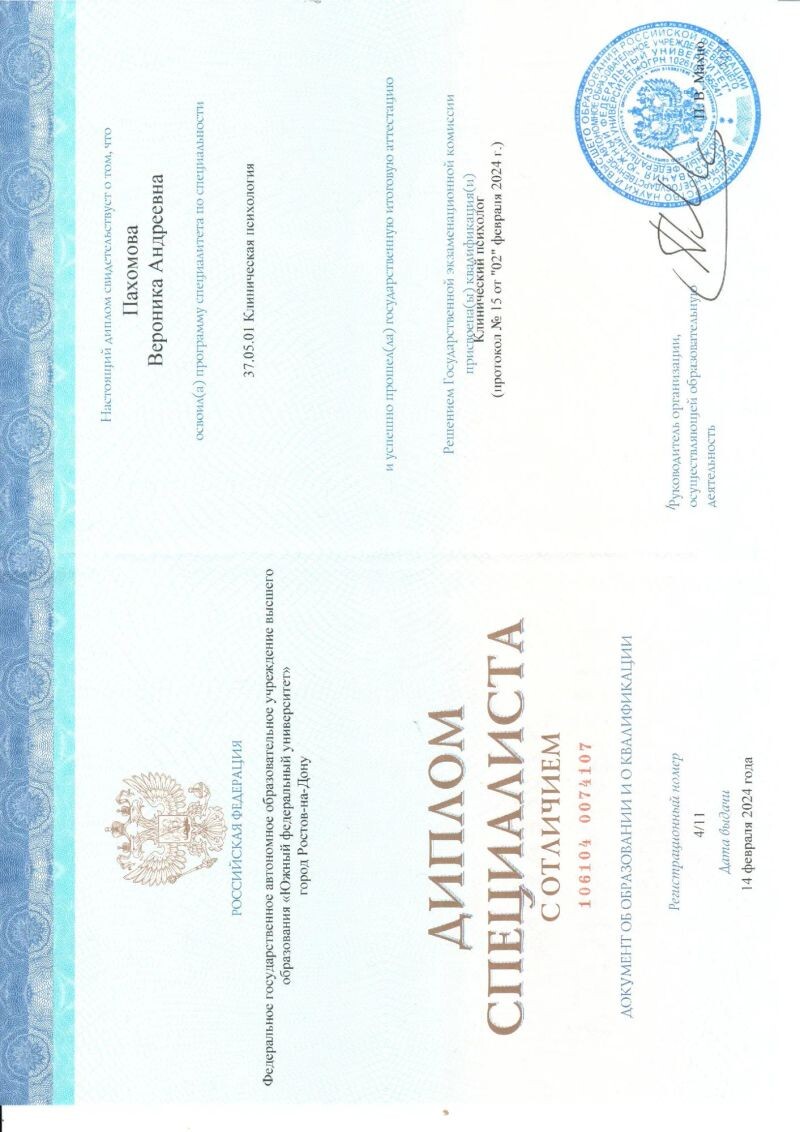 - ФГАОУ ВО «Южный федеральный университет» г. Ростов-на-Дону, клинический психолог, 2018–2024 гг.