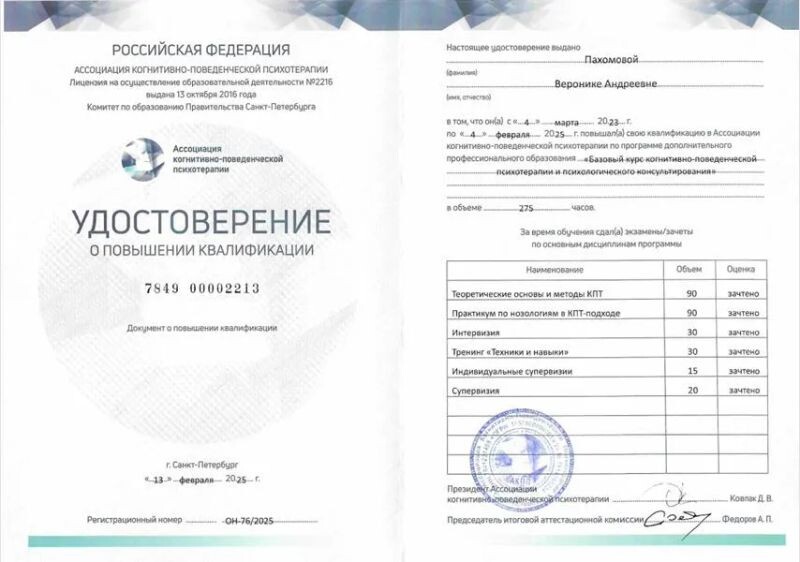 - АКПП, Когнитивно-поведенческая терапия, 275 часов, 2023–2025 гг.