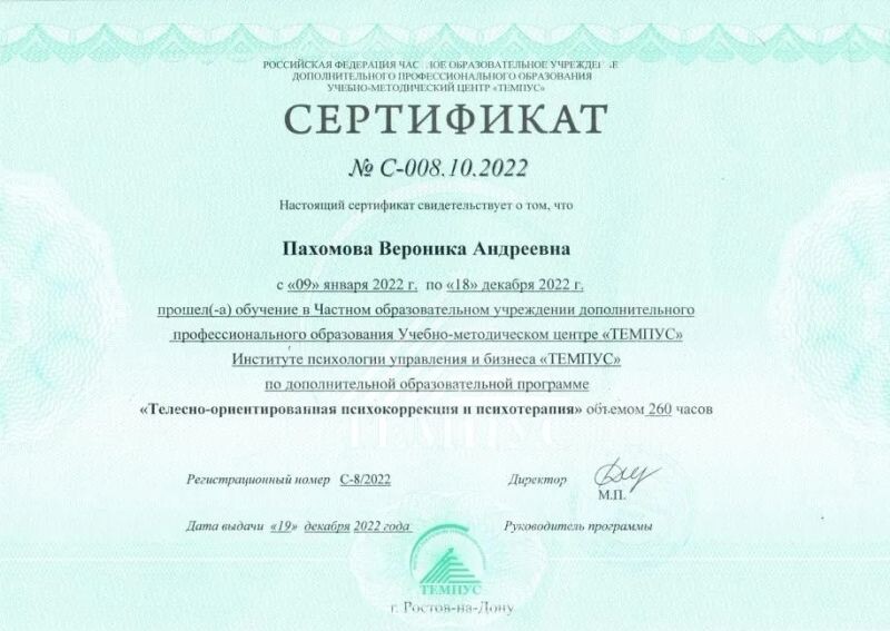- ЧОУ ДПО "ТЕМПУС", Телесно-ориентированные подходы, 260 часов, 2022–2022 гг.