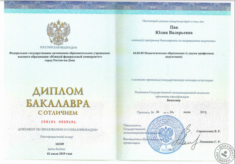 - ЮФУ, педагогическое образование, бакалавр, 2014–2019 гг.