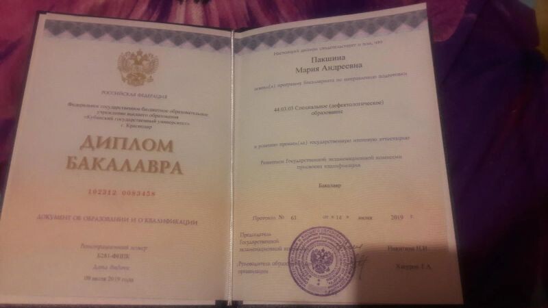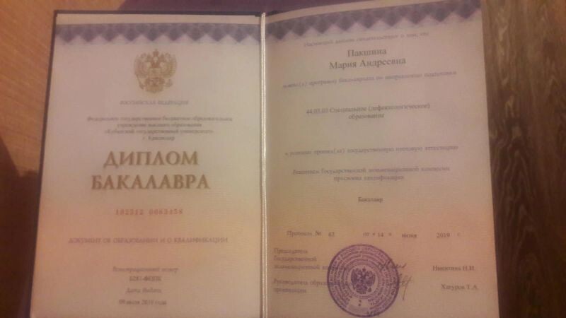 - Кубанский государственный университет, специальное (дефектологическое) образование, бакалавр, 2015–2019 гг.