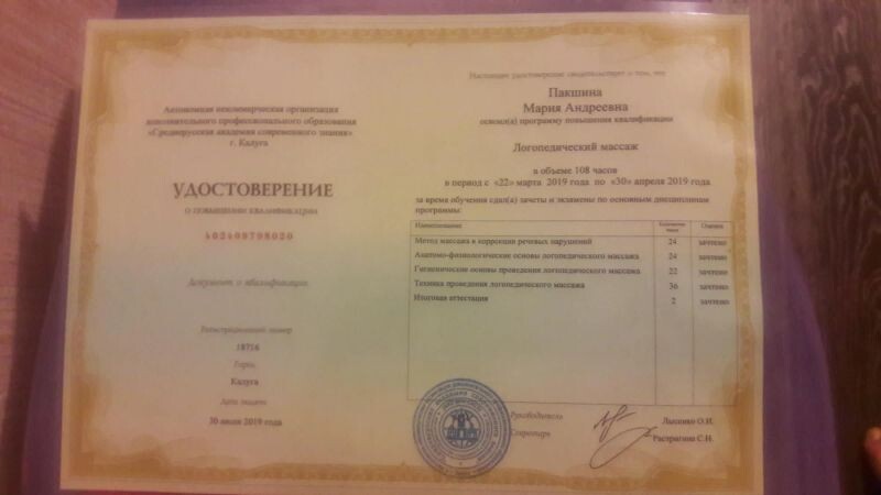 - Среднерусская академия современного знания, логопедический массаж, 2019 г.