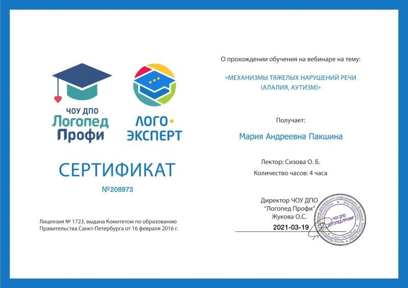 - ЧОУ ДПО «Логопед-Профи», механизмы тяжёлых нарушений речи (алалия, аутизм), 2021 г.
