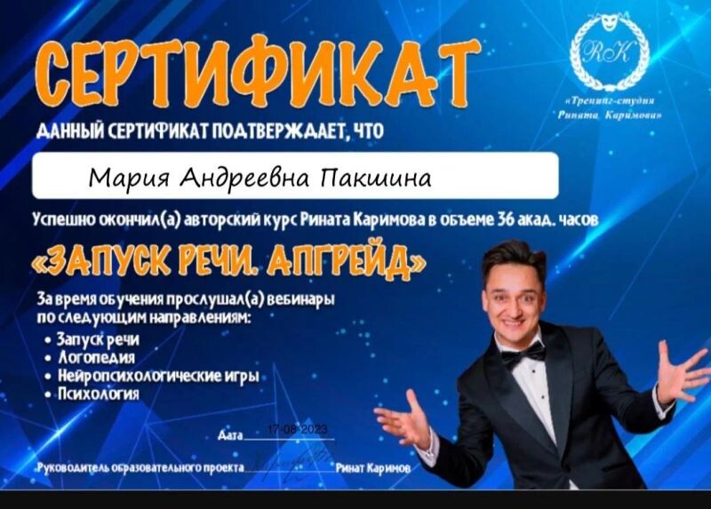 - Тренинг-студия Рината Каримова, курс «Запуск речи. Апгрейд», 2023 г.