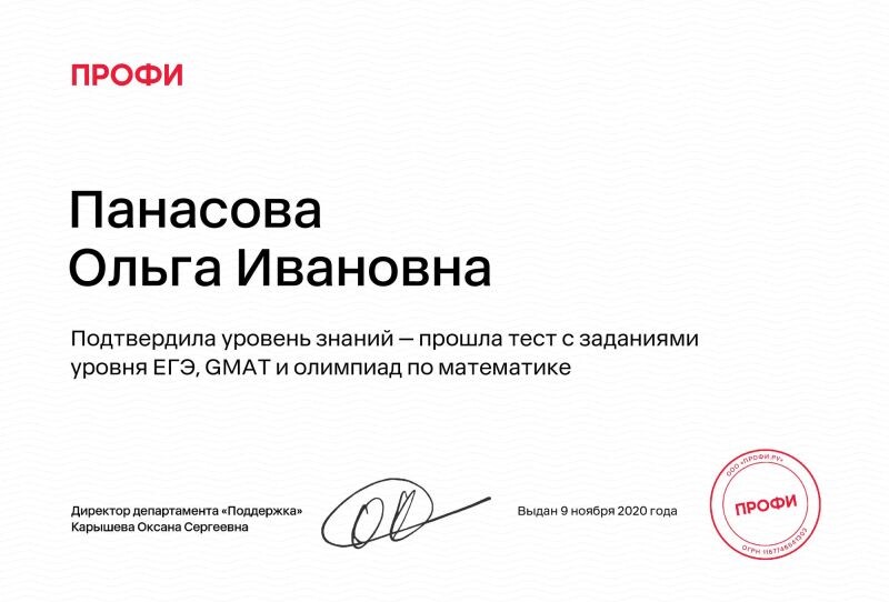 Ольга Ивановна очень талантливый преподаватель! Она прекрасно объясняет материал и делает его доступным. Мы обратились к ней с низкими знаниями, в школе не получали должной поддержки от учителей. За 5 месяцев мы смогли подняться до 4 баллов по алгебре и геометрии. Это для нас большой успех! Моя дочь теперь верит в свои силы и знания. Благодаря Ольге Ивановне она смогла получить 4 балла на ОГЭ по математике без подсказок. Замечательный результат! Рекомендую ее всем!